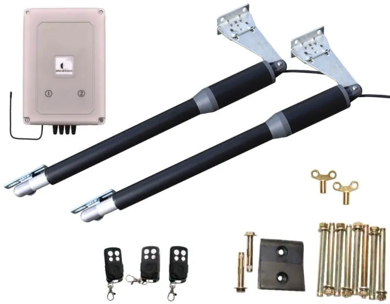 Obsah balení: 2ks pohonných motorů 24V, plně programovatelná řídící jednotka vybavena displejem pro zobrazení nastavení a transformátorem, tři dálkové ovladače s dosahem 50m z automobilu s plovoucím kódem, kompletní kovové pozinkované instalační příslušenství pro montáž (profily síly 6mm), gumový doraz pro křídla brány, 2ks odepínací klíče pro případ výpadku el. energie, podrobný návod na montáž a zapojení.