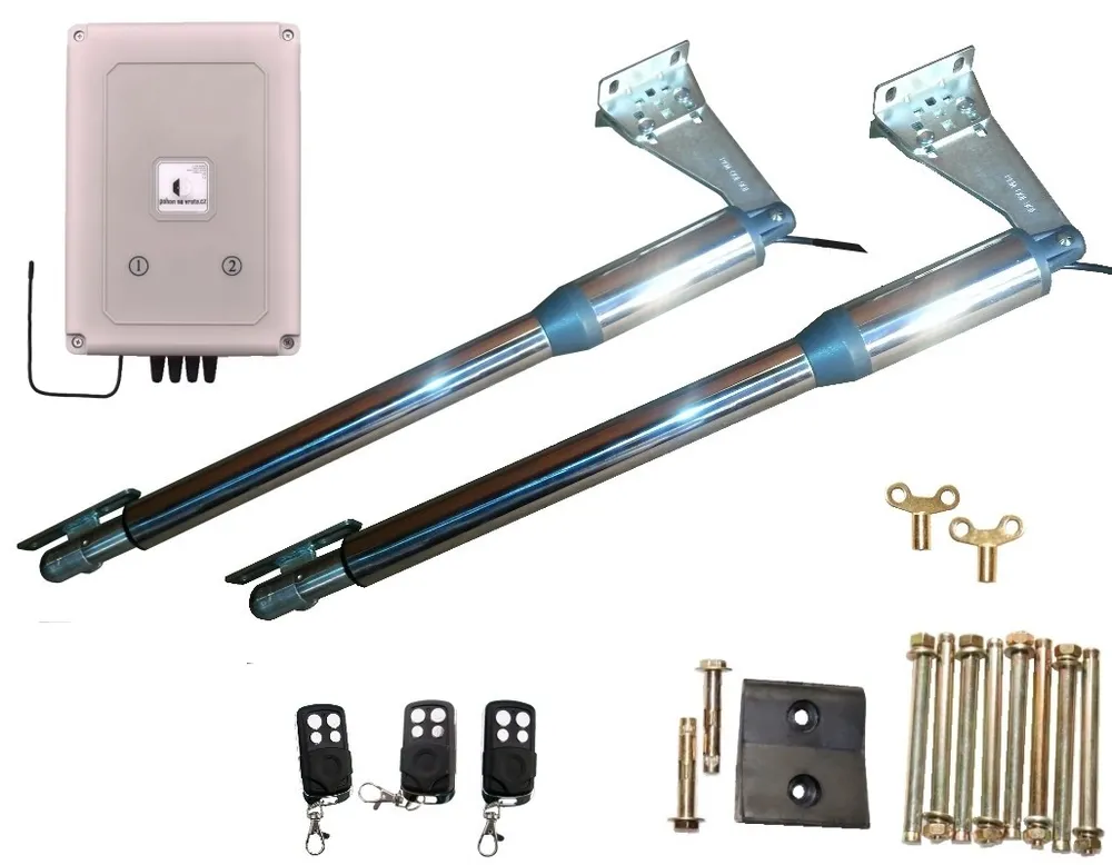 2ks pohonných motorů, kompletní kovové pozinkované instalační příslušenství pro montáž (profily síly 6mm), gumový doraz pro křídla brány, 2ks odepínací klíče pro případ výpadku el. energie, plně programovatelná řídící jednotka, dva dálkové ovladače s dosahem 50m z automobilu (+ nyní jeden ovladač navíc zdarma), podrobný návod na montáž, zapojení a nastavení v češtině (i s možností montáže ven z areálu).