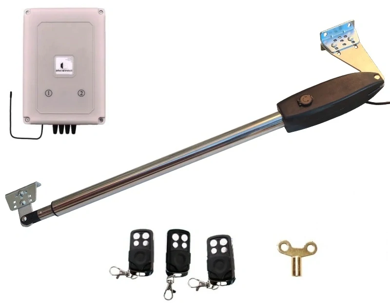 Obsah balení: 1ks pohonného motoru, kompletní kovové pozinkované instalační příslušenství pro montáž (profily síly 6mm), 1ks odepínací klíč pro případ výpadku el. energie, řídící jednotka + tři dálkové čtyřkanálové ovladače (s kovovým rámečkem a zajížděcí krytkou spínačů) s plovoucím kódem, podrobný návod na montáž, zapojení a nastavení. K sadě nezasíláme gumový doraz, neboť se většinou zavřené křídlo opírá o sloupek. Pokud ale doraz požadujete, napište to do poznámky k objednávce a my Vám jej k objednávce přibalíme.