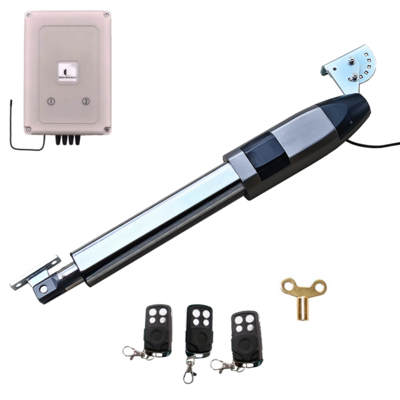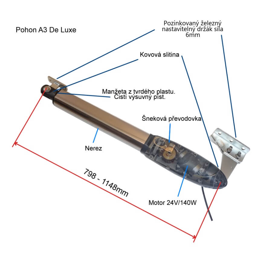 Kompletní set pohonu A3 De Luxe pro jednokřídlou bránuje je luxusně vypracovaný a také nejsilnější pohon v naší nabídce. Je osazen velmi silným, tichým motorem 140W na bezpečných 24V a masivní šnekovým převodem. Pro vrata s hmotností křídla 300kg a délkou 3,5m nebo do 250kg a délkou 4m, záleží na velikosti výplně křídla brány - průchod větrem, úhlu otevírání.) Tento typ pohonu je vhodný i do starých průjezdů, kde se již vrata nepohybují zcela hladce a je zapotřebí větší síly pro dovření vrat, nebo do míst, kde silný vítr brání zavírání a to jak pro směr dovnitř, tak i směrem ven z areálu.